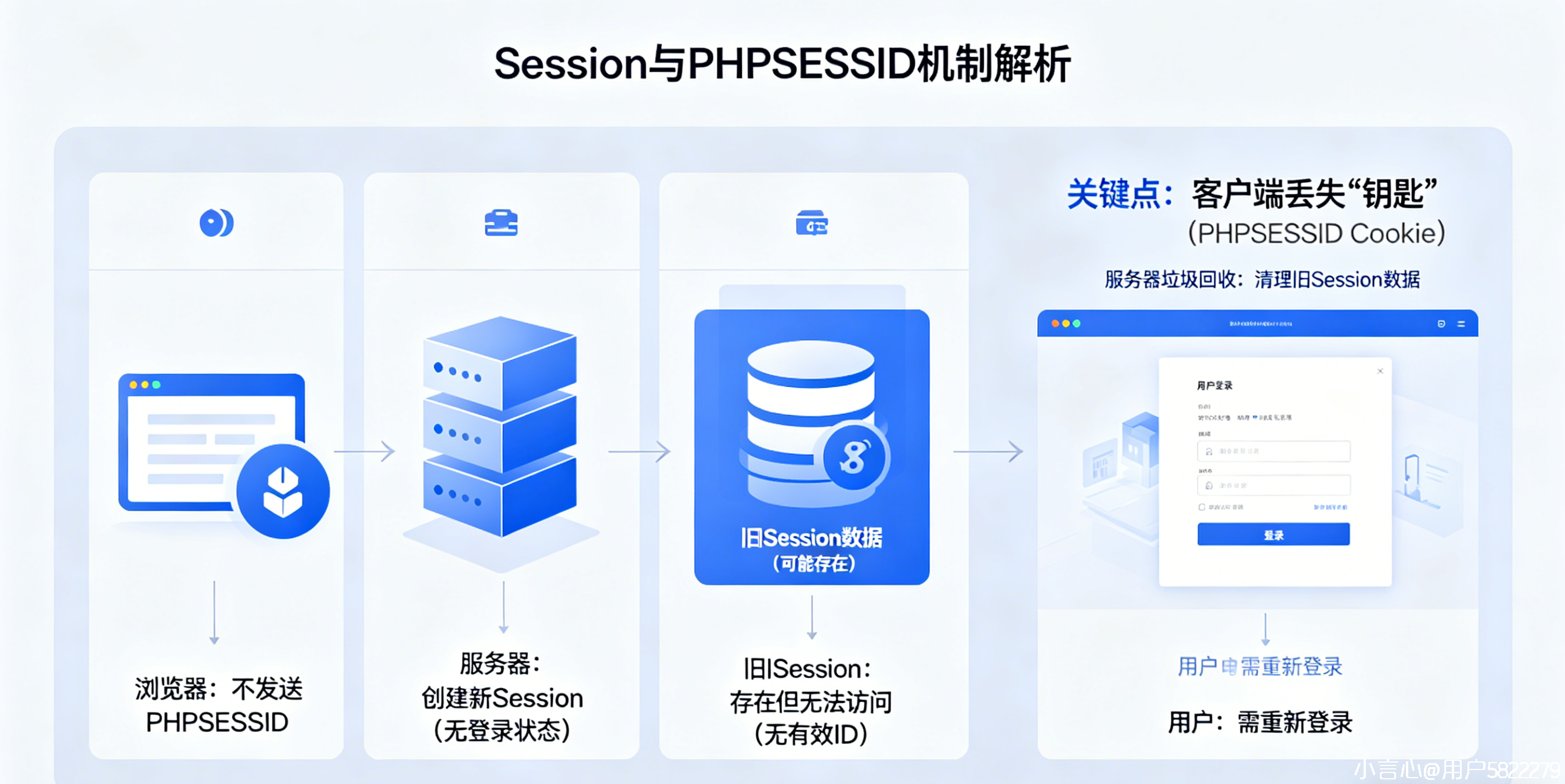 ​​客户端标识:​​ 为了将用户与服务器上的 Session 数据关联起来,PHP 使用一个名为 PHPSESSID的 Cookie。​​这个 Cookie 的默认生命周期是“浏览器会话”​​。这意味着: